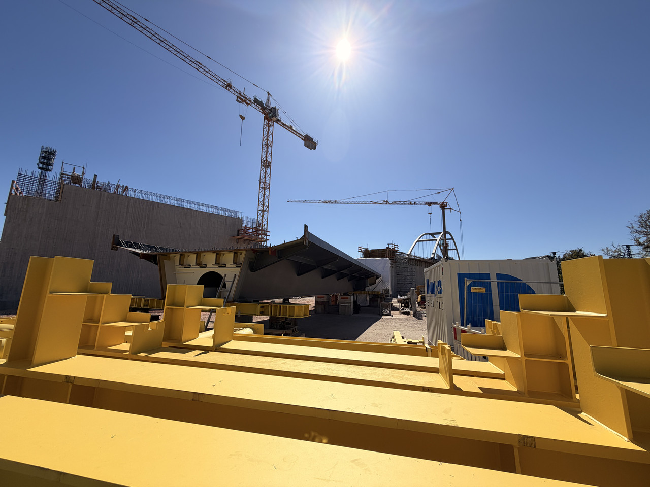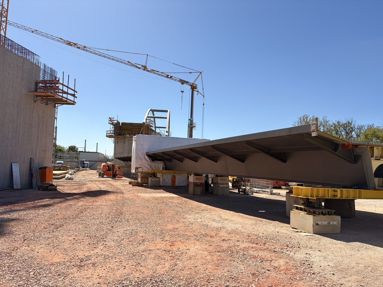 Am Stadion wurde fleißig weiter an den Pfeilern für die Überführung über die Main-Neckar-Bahn betoniert. Der nächste Träger liegt nun unten bereit und wartet darauf - vermutlich im direkten Anschluss an die Stabbogenbrücke - eingehoben zu werden.