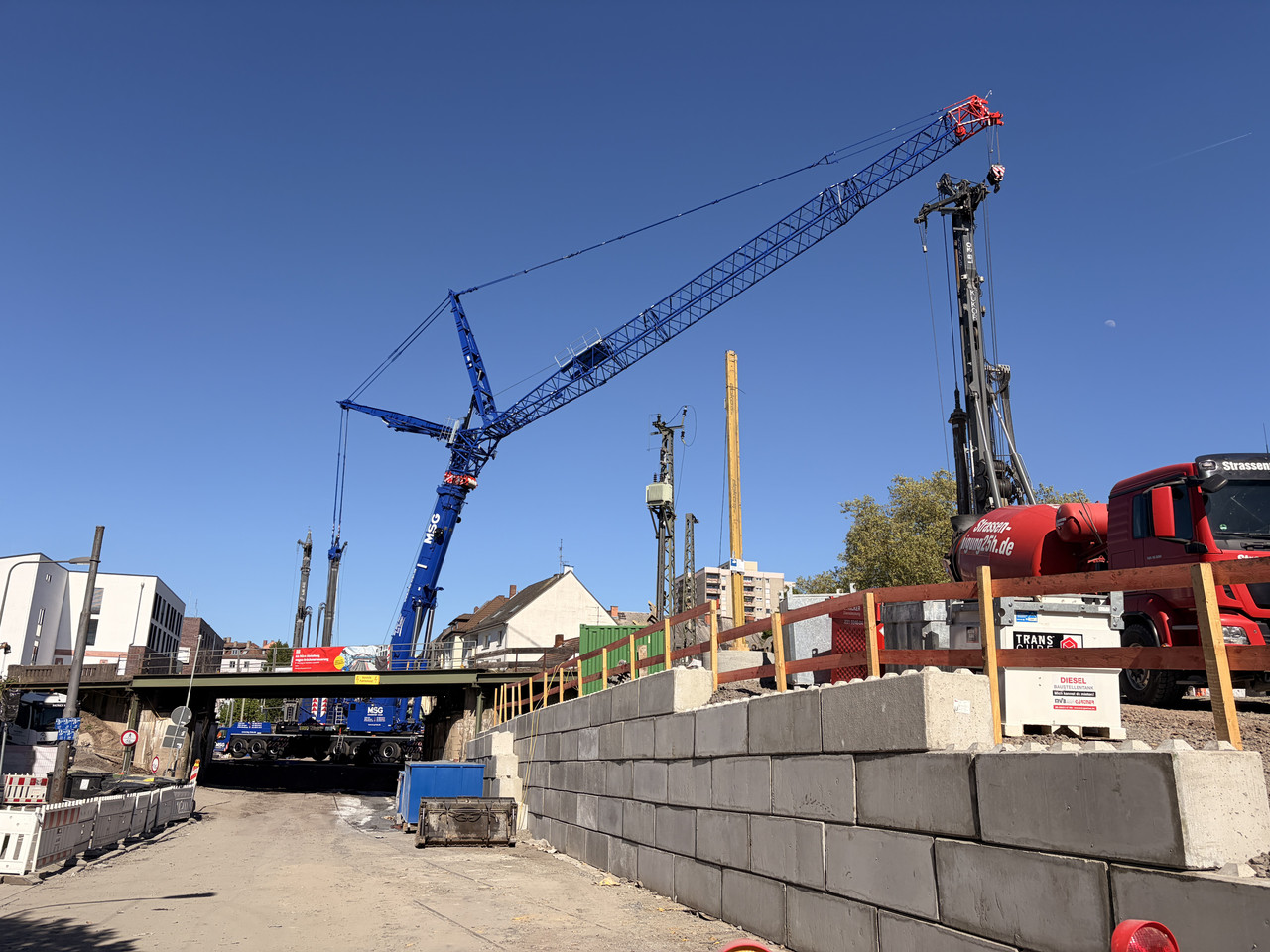 An der alten Eisenbahnbrücke über die Mörfelder Landstraße wurde heute der Mobilkran in Stellung gebracht, der die alte Brücke ausheben wird. Schätze, dass es morgen soweit sein dürfte.