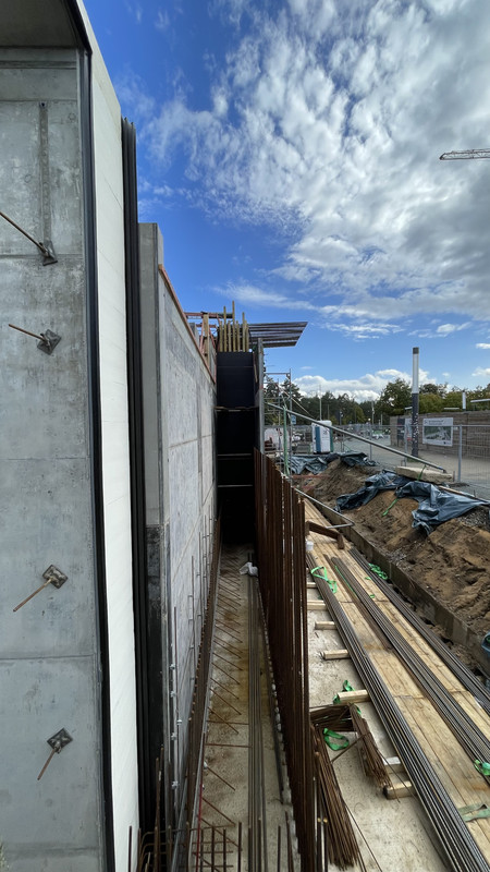 Am Stadion-Haupteingang haben die Bauarbeiten für den RTW-Haltepunkt Mörfelder Landstraße/Stadion begonnen. Auf der Ostseite der Mörfelder Landstraße sehen wir Großgerät, mit dem eine Baugrubenverbau eingebracht wurde. Auf der Stadionseite haben die Erdarbeiten für die Verbreiterung des Bahndamms begonnen.