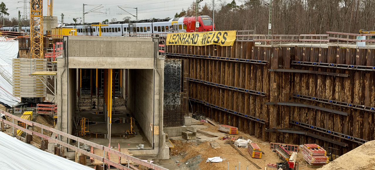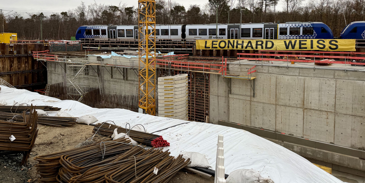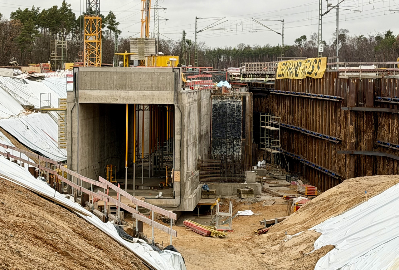 Beim Kreuzungsbauwerk sind noch die Wände, die Decke und die Widerlager fertig zu stellen bevor der diagonal verlaufende Überbau gebaut wird. Den Verschub unter die Bestandsgleise würde ich daher im Sommer 2026 vermuten. Dabei würde dann zuvor der Durchstich im Bahndamm hergestellt.