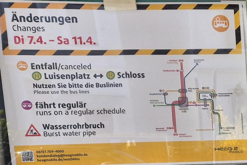 Bei der HEAG steht noch nichts, allerdings gibt es Aushänge an Haltestellen. Demnach werden 4, 6 und 8 über Bismarckstraße und Hbf umgeleitet (Entfall Luisenplatz). Die 4 entfällt zwischen DA und Griesheim. Die 3 entfällt Mo bis Fr tagsüber komplett, im Spät- und Wochenendverkehr fährt sie über die Rheinstraße. Ersatzweise fährt die 7 Mo bis Fr tagsüber im T10 und die 9 zur ganzen Zeit nach Griesheim. Die 4 ist am Hbf mit 2 bzw. 3 verknüpft. 3 und 9 fahren, anders als sonst, am Sa tagsüber im T10. Zu den Buslinien, die zwischen Luisenplatz und Willy-Brandt-Platz verkehren, schweigt sich die Meldung aus.